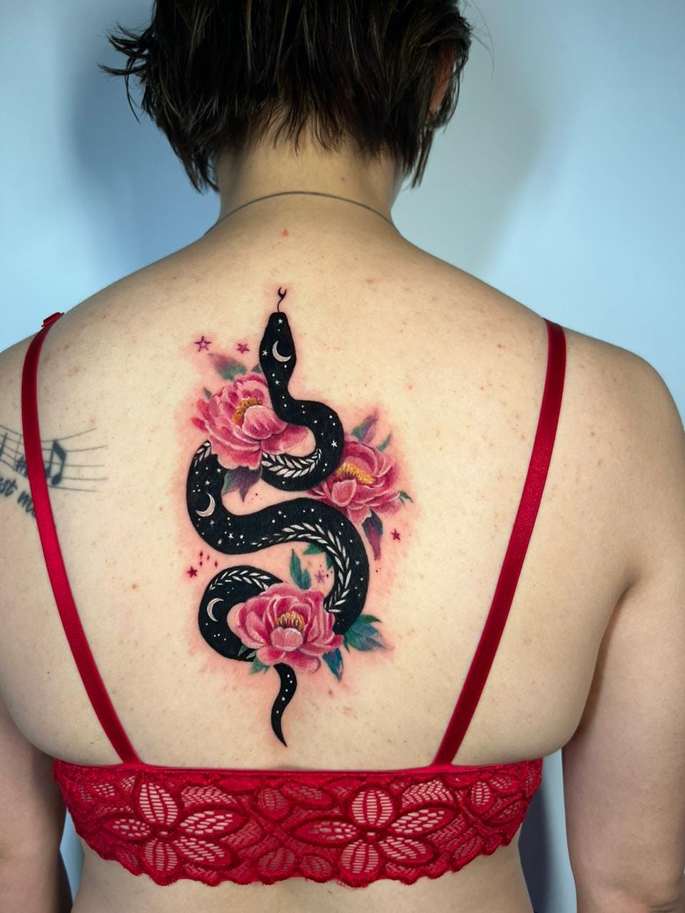I love peonies, they are gorgeous flowers and they also had a slightly Chinese sentiment to them because peonies 牡丹花 are the National Flower of China. So it was a connection to my Chinese roots. The decision to include a snake was in part because I was born in the Year of the Snake, the year of the earth snake if we are being very specific but given we were heading to my 36th birthday in the year of the snake this would be seen as an early birthday present to me (I got it exactly a month before my birthday).